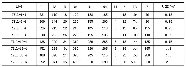 YZUL系列立式振動電機技術參數及外形尺寸表: