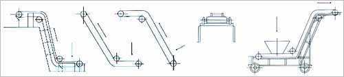 為獲得較好的受料和卸料條件,本機采用“Z”形布置形式。即設有上水平段、下水平段和傾斜段,并在下水平段受料,在上水平段卸料。上水平段與傾斜段之間采用凸弧形段機架連接,下水平段與傾斜段之間采用凹弧段機架相連以實現輸送帶的圓滑過渡。