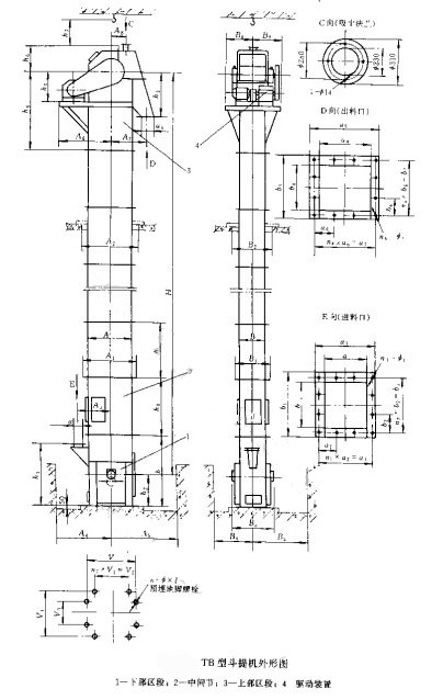 TB型垂直斗式提升機(jī)的結(jié)構(gòu)形式繁多,請(qǐng)按《TH、TB型垂直斗式提升機(jī)選用與使用說(shuō)明書(shū)》進(jìn)行選型設(shè)計(jì),提供訂貨總圖或委托制造單位選型設(shè)計(jì),但需提供所必需的原始資料。安裝基礎(chǔ)螺栓由用戶自備。